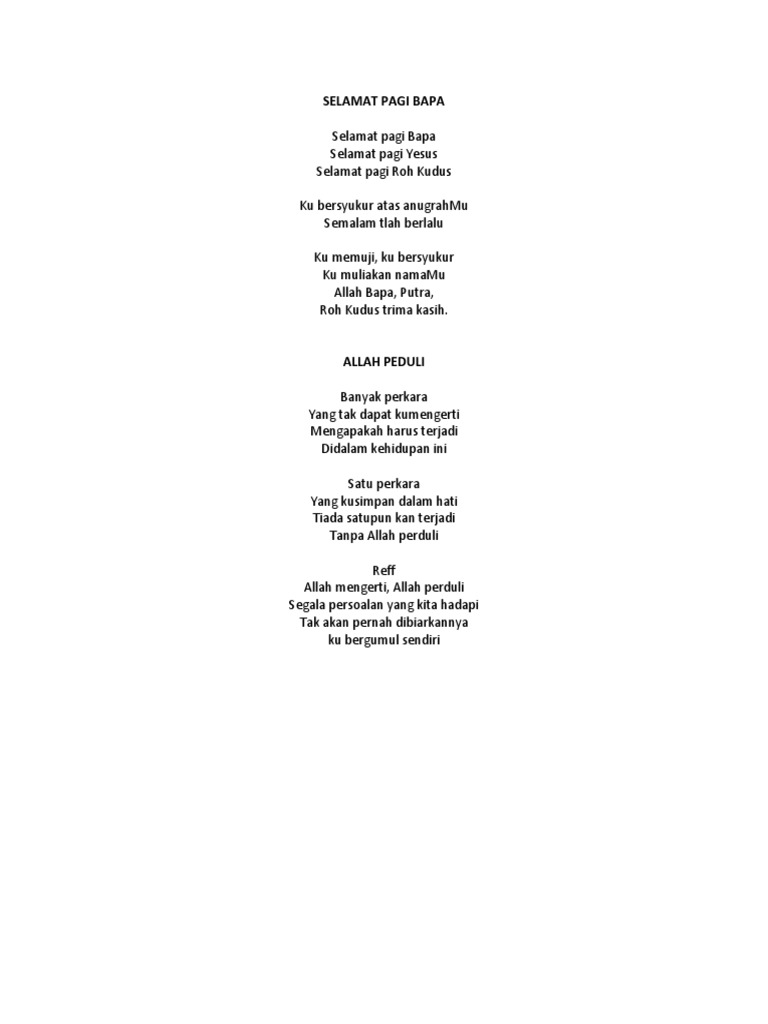 Not Lagu Selamat Pagi Bapa from imgv2-2-f.scribdassets.com Selamat pagi bapa selamat pagi yesus selamat pagi roh kudus t'rima kasih atas anug'rahmu semalam t'lah berlalu. Trima kasih atas anugrah_mu semalam t'lah berlalu. Am d g embun membasahi dunia dan mulai mengawali hari ini. Lirik lagu indonesia terbaru dan lagu dari suku maupun manca negara dan arti lirik , terjemahan lagu. Berikut ini adalah lirik dan chord lagu selamat pagi bapa dari nikita. Lirik selamat pagi bapa oleh sunday school. C g am em selamat pagi bapa, selamat pagi yesus. Chord selamat pagi bapa (nikita).