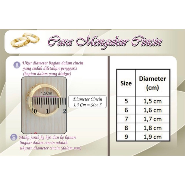 Size Lingkar Cincin : Beri tahu penjual cincin jika anda berencana membeli cincin jenis ini.. Pada prinsipnya cara pengukuran cincin dan gelang adalah hamper sama, namun ada sedikit perbedaan, yaitu kalau ukuran cincin harus pas (jangan kelonggaran / jangan kekecilan) tapi kalau ukuran gelang harus longgar, artinya rangka gelang yang melingkar pada pergelangan tangan anda harus ada ruang atau tidak ngepas seperti cincin, yang rangka/ring nya menempel rapat. Setelah 2 cara pengukuran sederhana seperti di atas anda lakukan, maka anda akan mengetahui panjang diameter ring cincin atau panajng lingkar/keliling jari anda, dan informasikan kepada kami ukuran tersebut untuk kami konversikan kedalam ukuran ring cincin. Ukuran size cincin berdasarkan lingkar jari: Di amerika serikat dan kanada , ukuran cincin ditetapkan menggunakan skala numerik, dengan ukuran seperempat dan setengah. Dengan menggunakan keliling jari :